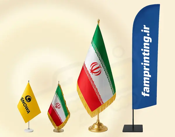 از پارچه ساتن براق یا مات یا مخمل برای چاپ پرچم استفاده میشه که هم زیبا هستن و هم دوام بالایی دارن.